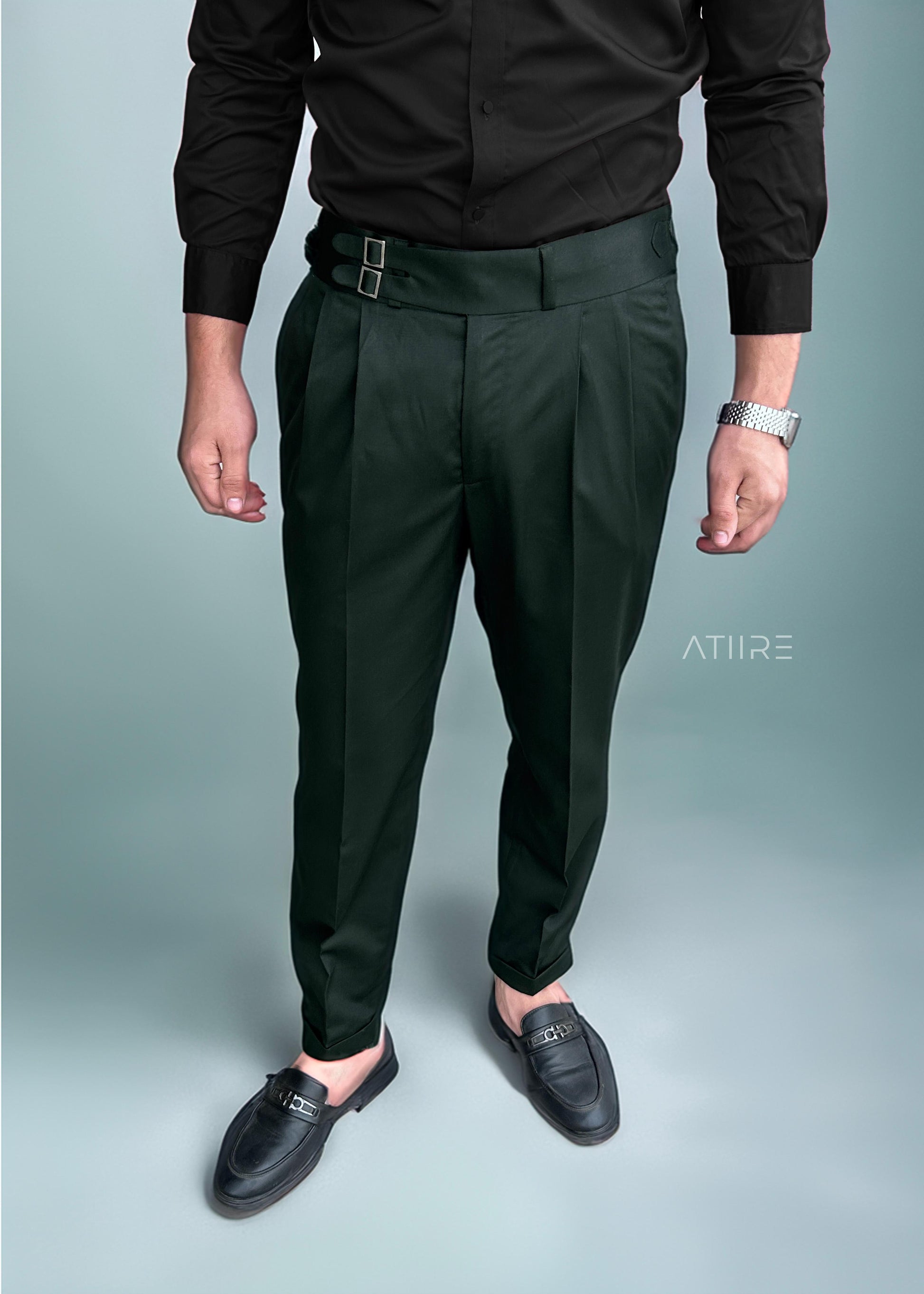 BOTTLE GREEN DOUBLE PLEATED BUCKLE GURKHA PANTS BY ATIIRE